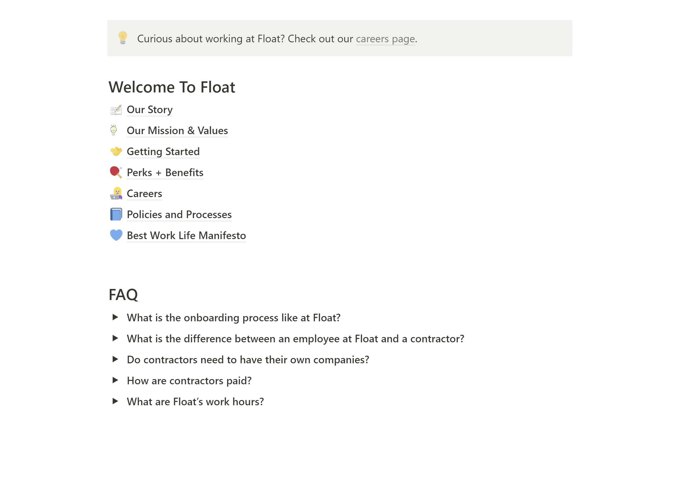 The result of the process is a public-facing handbook created using Notion Teamspaces. This comprehensive guide provides full context on what it's like to work at Float, what you need to know when you first start, and where to find information as a team member.