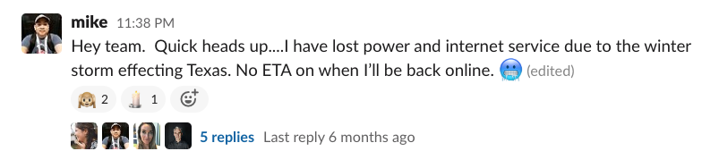 For example, when a power outage hit Mike's home state of Texas after a severe winter storm, we were all quick to help as best as we could to cover his workload!