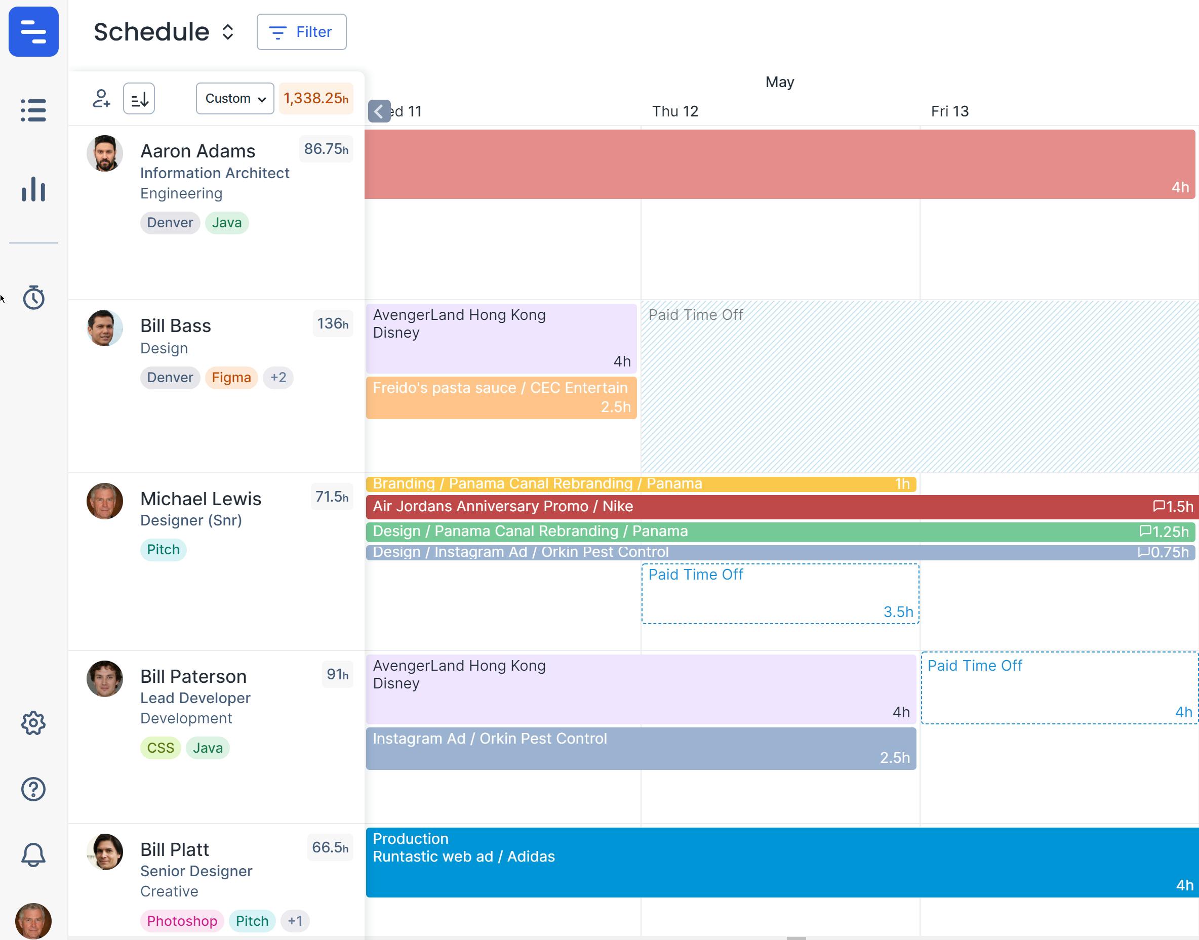 Make Float the source of truth for your team's time and capacity by integrating with your calendar to combine meetings and other events into the schedule. Keep workloads sustainable with red overtime indicators signaling when a team member's overscheduled. You can even filter and sort your team based on available hours within a selected timeframe.