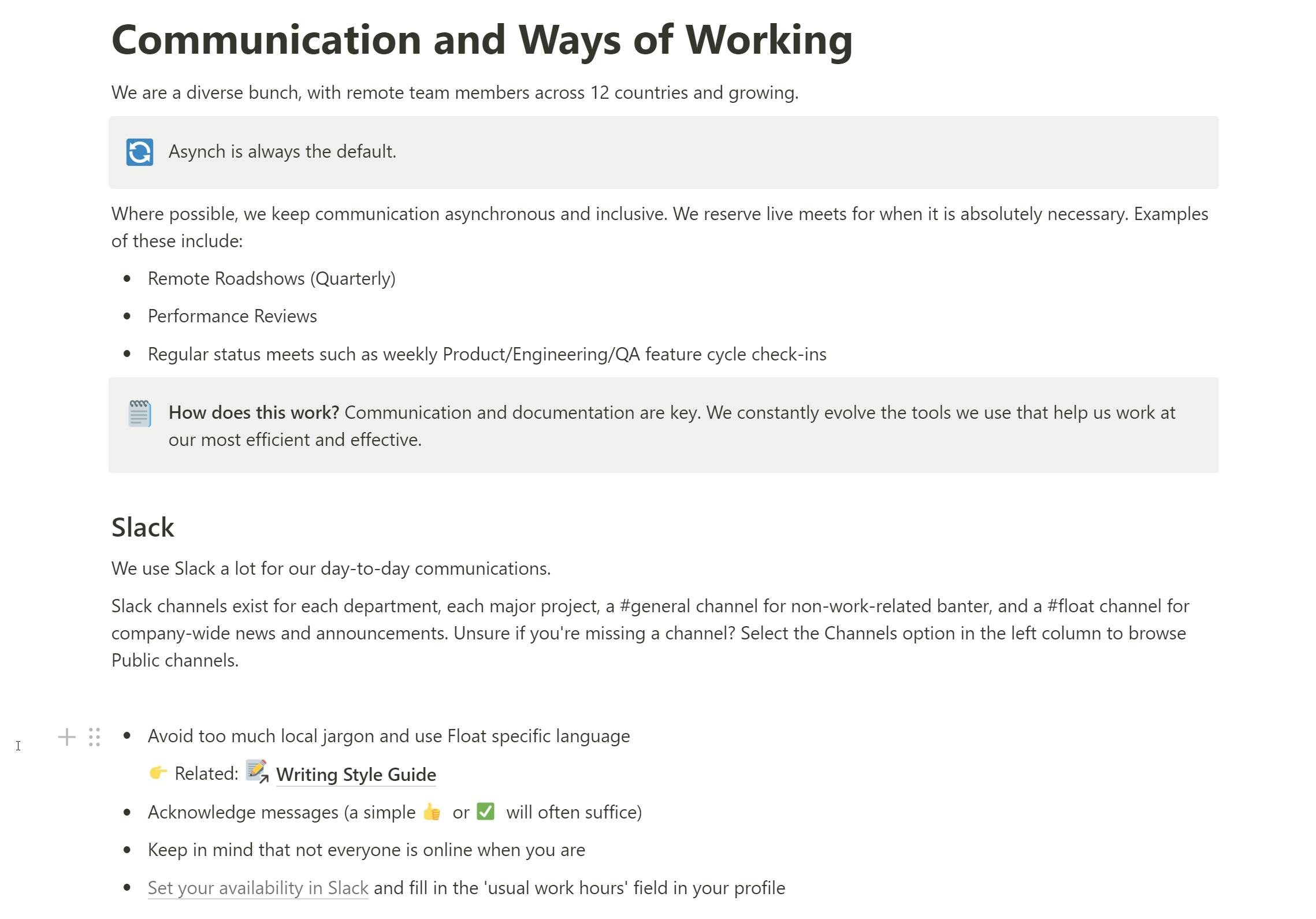 - Quarterly company-wide presentations (e.g., the Float Remote Roadshow)