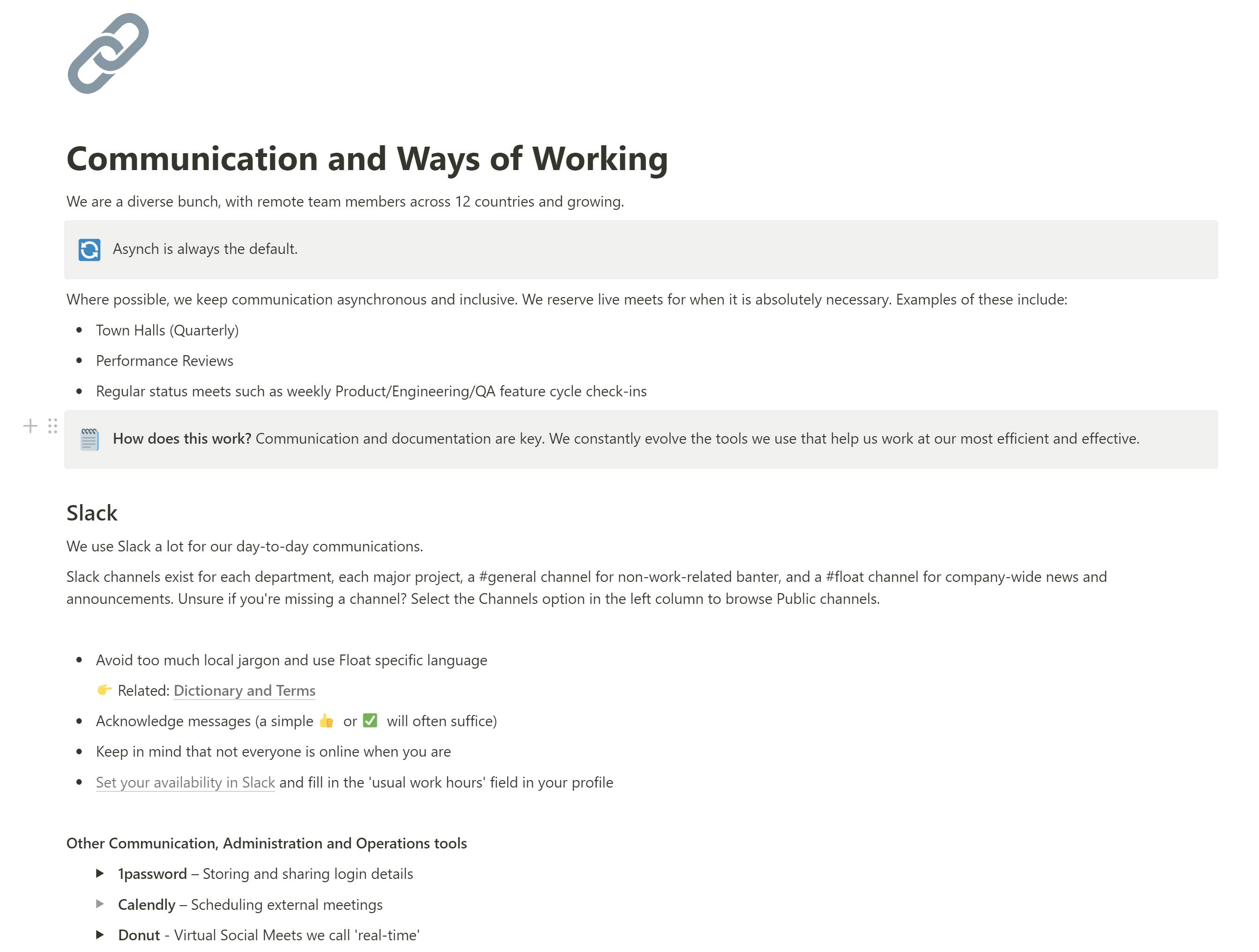 At Float, we use Notion as a directory of sorts for our remote team—a compass for who’s who and where’s what. Our team resources and documentation are designed to be accessible and delivered in a self-service format by new and old team members alike. That way, there's no need to ask someone for information that we can easily find ourselves.