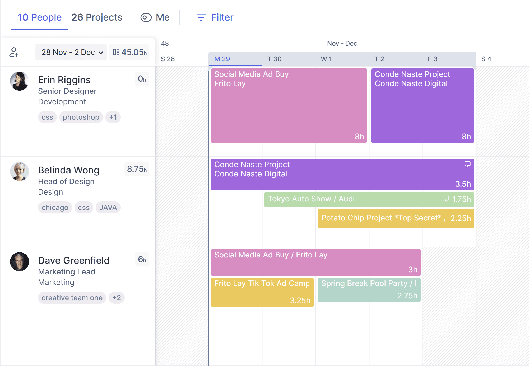 In the People view, each person's unscheduled hours display next to their name, and your team's total remaining capacity is shown next to the date range at the top.