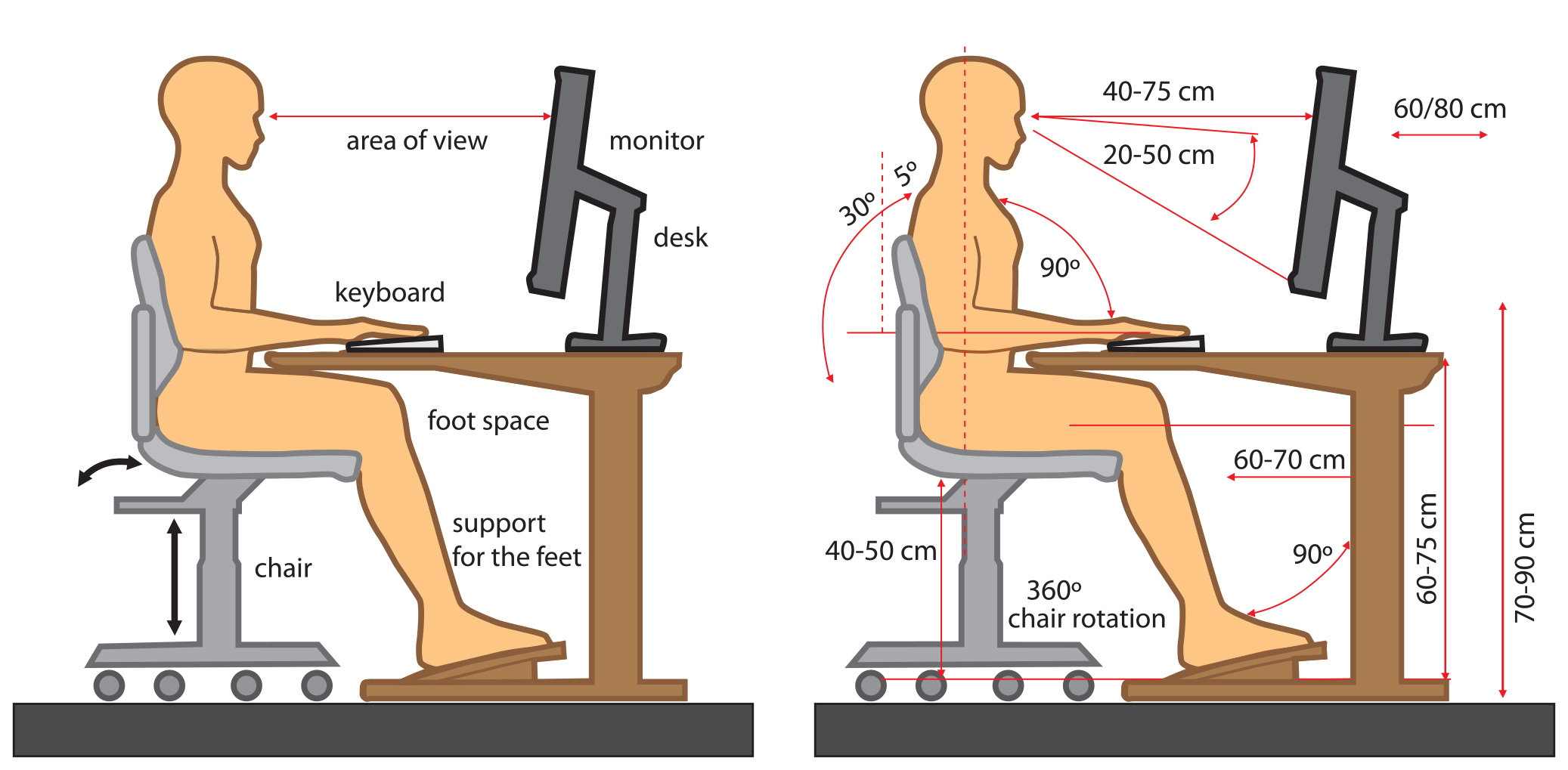 The distance between eyes and screen is also essential. Optometrists recommend positioning computer screens between 20 to 28 inches away from your eyes. In fact, there are a whole bunch of measurements that can improve body posture while working (and relieve back pain and other issues).