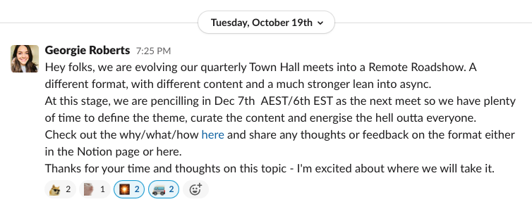 As an asynchronous remote organization, we don't have one default location, so holding an all-people meet at a particular time didn't feel very inclusive. Some team members logged on after midnight to participate in past town halls, and by the time we’d reach the Q&A portion at the end, most folks were overdue to go to (or back to) bed. Also, with more departments across the business, it became increasingly challenging to fit more than three presentations into an hour in a way that was still meaningful and effective.