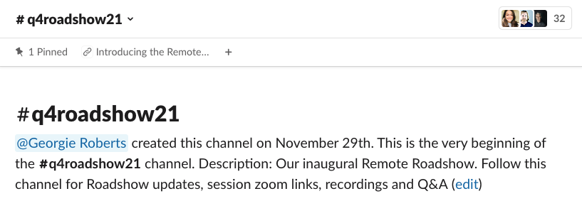 1. One week out, we created a dedicated Slack channel #Q4Roadshow21 and added all Float team members. We set the channel description with what to expect, linked to more details in the topic, and shared the speaker agenda.