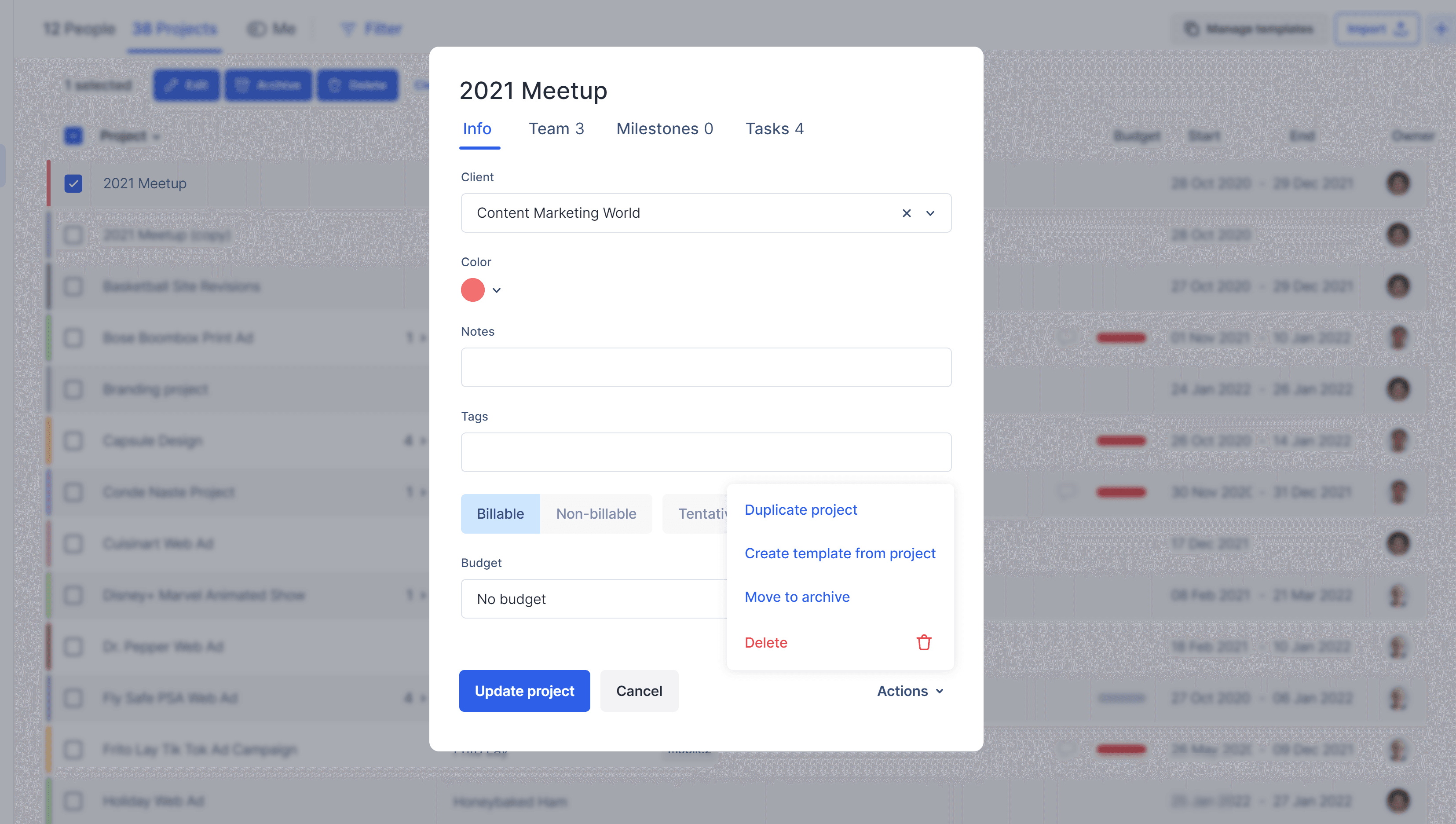 To create a new template from one of your existing projects, click the project menu and then select Actions > Create template from project.