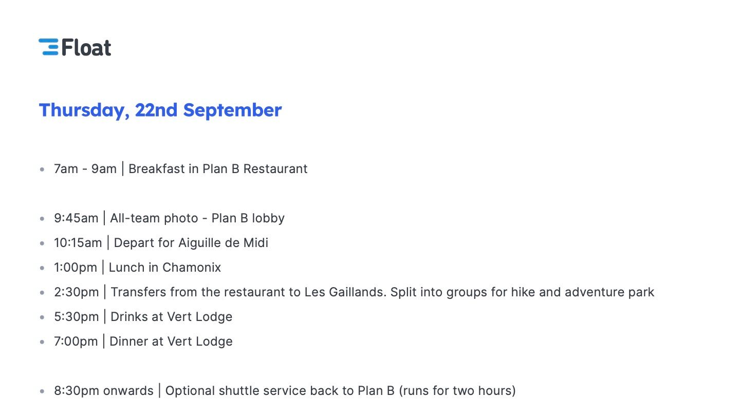 - Avoid school holidays and popular team holiday periods where we can. This is the most important reason we chose to hold our meetup between seasons! We are big on encouraging our team to take time off away from Float. It’s important that we don’t interrupt our team’s existing travel plans with their loved ones.