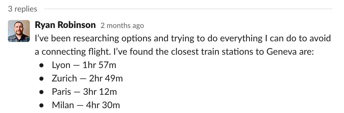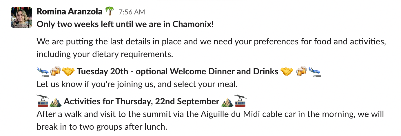- Create a source of truth for event planning and logistics months prior. We used Notion as a dedicated event page for our event. This was a one-stop page with information and links to the schedule, location, visa details, and travel policies. As part of the event page, we had a Team Travel Plans page, where our team added their information—such as arrival times, flight numbers, and vacation plans. We encouraged everyone to make a holiday out of it. Storing the information in this way helped the smooth planning of transfers in and out of the event, and allowed some of our team to plan trips together on either side of the meetup.