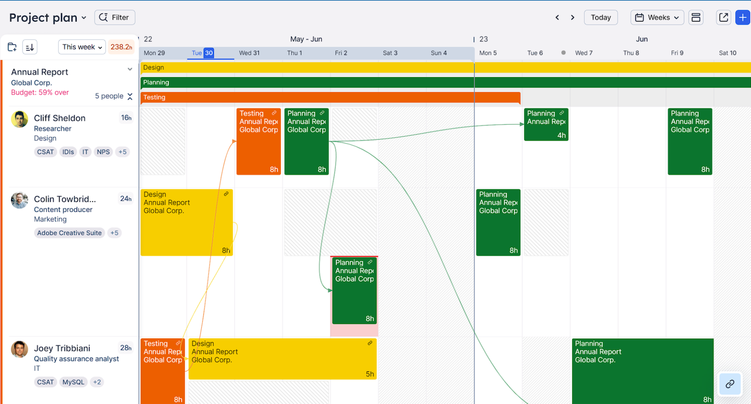 Resource management software helps you spot gaps in advance. Closely monitor the workloads of team members who move between several departments to prevent resource overallocation and burnout.