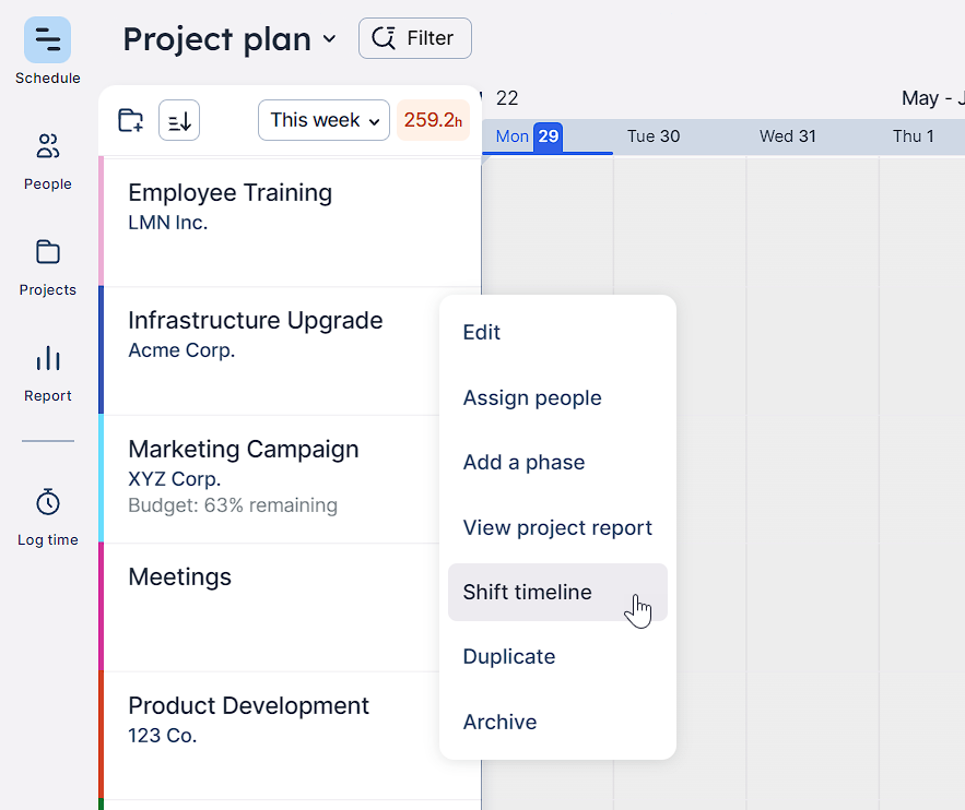 For example, the Project plan in Float lets you perform quick actions like shifting timelines, assigning new people, adding deliverables, and duplicating projects in just a few clicks (without any formulas breaking 😅).