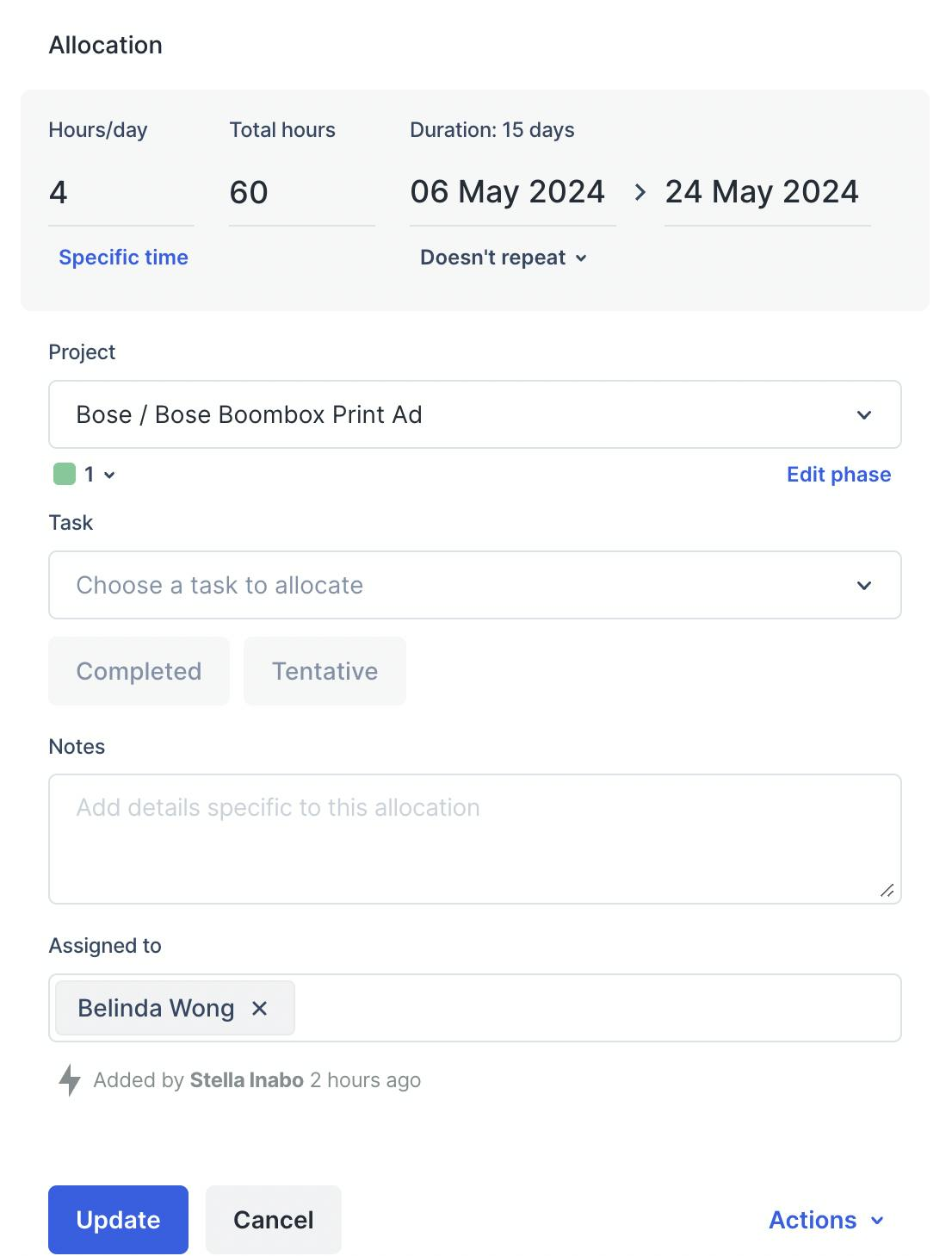 Resource allocation involves allocating the right people’s time—in hours or percentages—to projects that match their skills. Take a look at the example below: this creative agency has been tasked with the project of creating a print ad for the new Bose boombox, which will require 60 hours spread across the next 15 days.