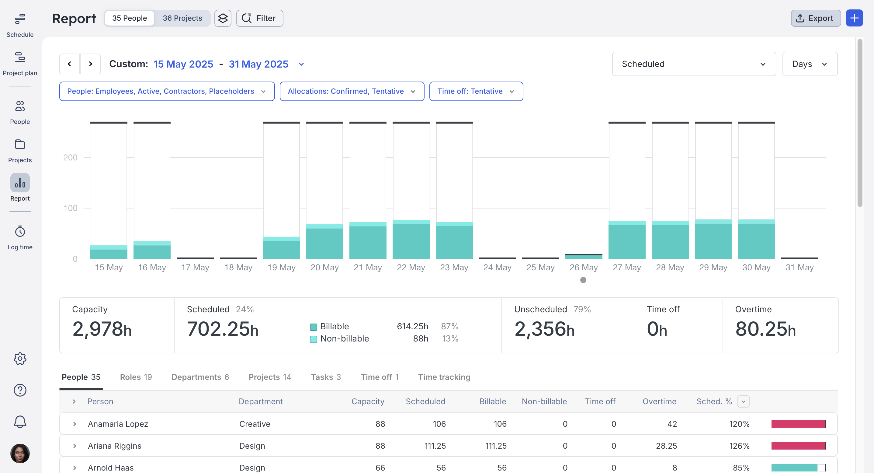 Your team's availability will vary depending on their workload, time off, and administrative tasks. Resource management tools like Float help you track this by allowing you to filter by role or department and view capacity directly on the schedule.