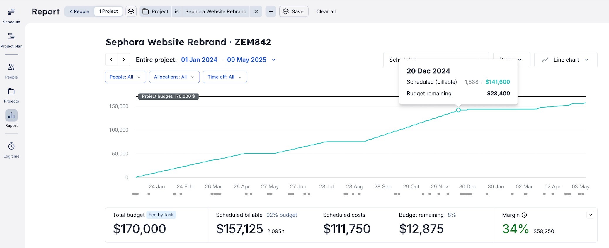 Once you have a rough idea of who’s needed and when, it’s time to translate that resource plan into a cost estimate. Apply team members’ rates, allocate tentative hours, and set a working project budget. This gives you early visibility into projected costs and margins—and helps you evaluate trade-offs before finalizing assignments.