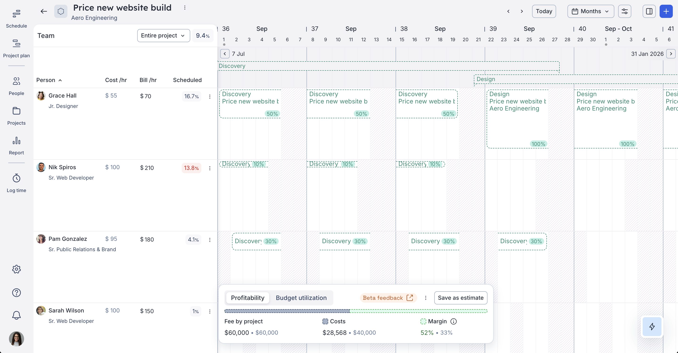This baseline estimate becomes your reference point. As the project progresses and the schedule is adjusted, you’ll be able to track how actual allocations impact your profitability and timelines.