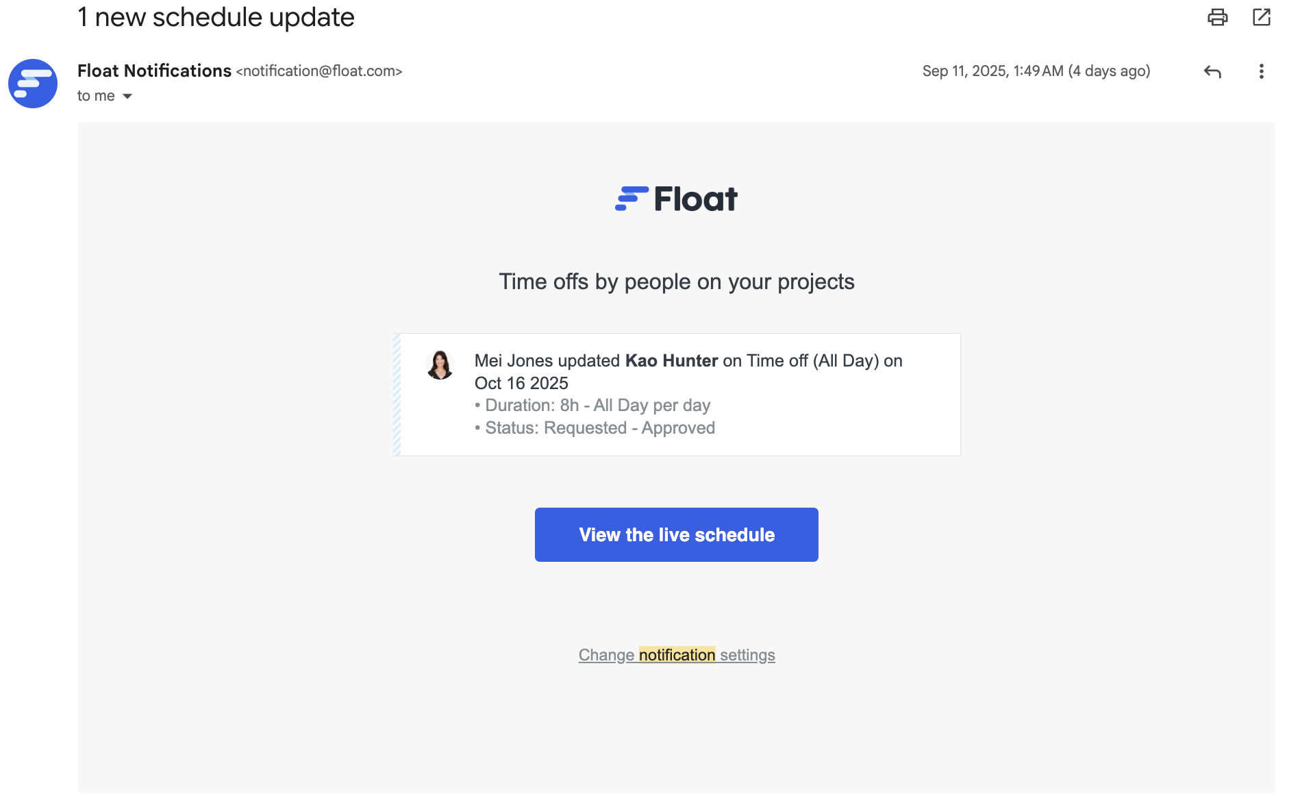 Updates should happen in real-time so that as soon as something changes (like a team member calling in sick) and project timelines change, team members are notified of the new resource plan. For example, email or chat notifications will be sent to team members once you make changes to allocations in Float.