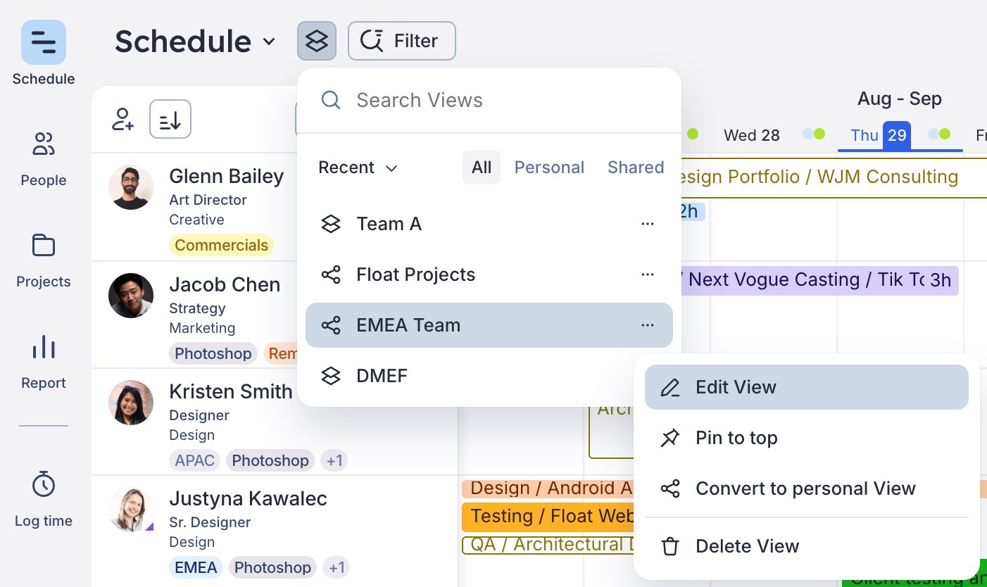 If you’re using a tool like Float, you can even create saved views to share with stakeholders, so they can access the information they need faster.