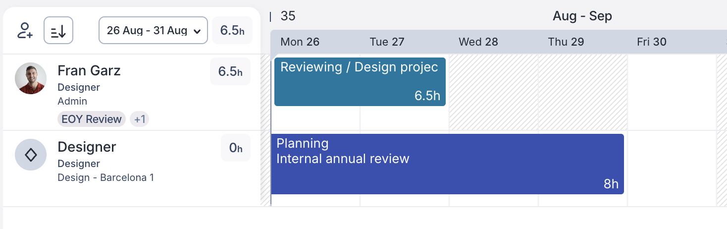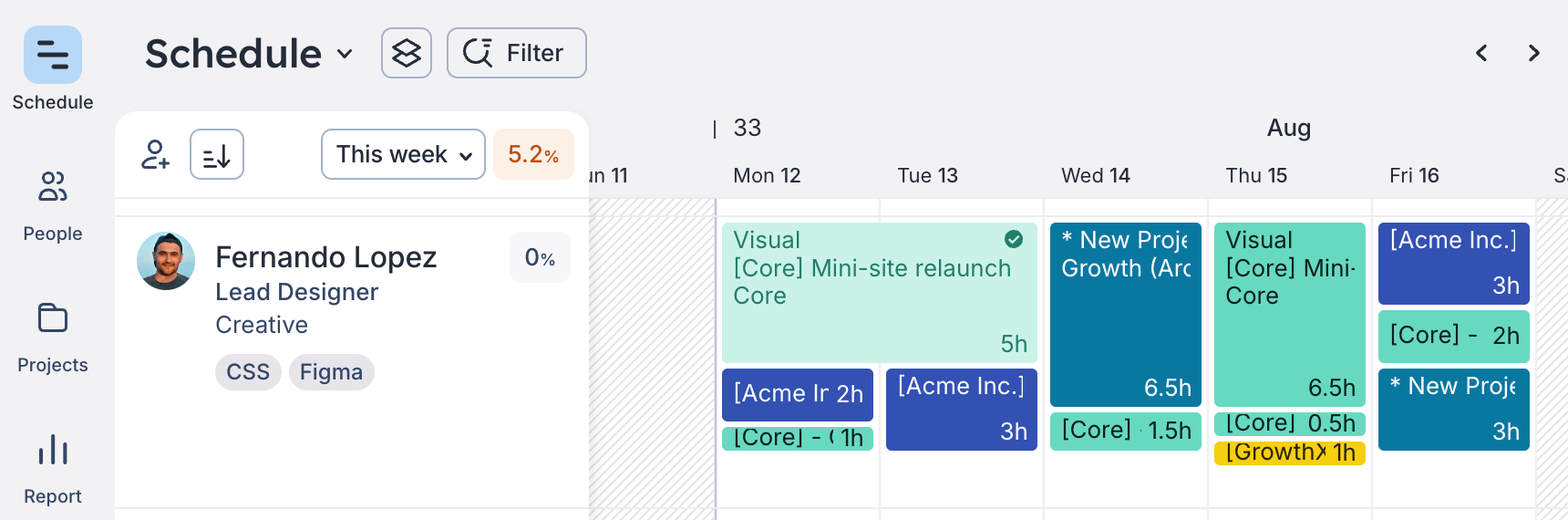 In this way, a resource schedule is your org’s central hub, where team members can go to get a broad overview of how everyone’s time is spent. This includes: