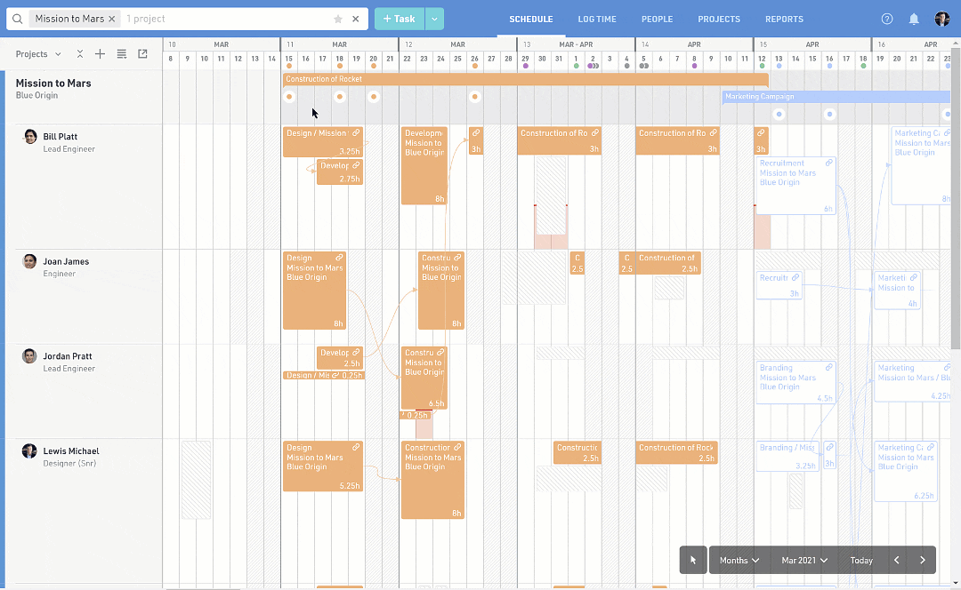 Creating PERT charts today is much easier when using a resource management tool like Float. You can get a birds-eye view of an entire project before it starts, avoiding potential bottlenecks.
