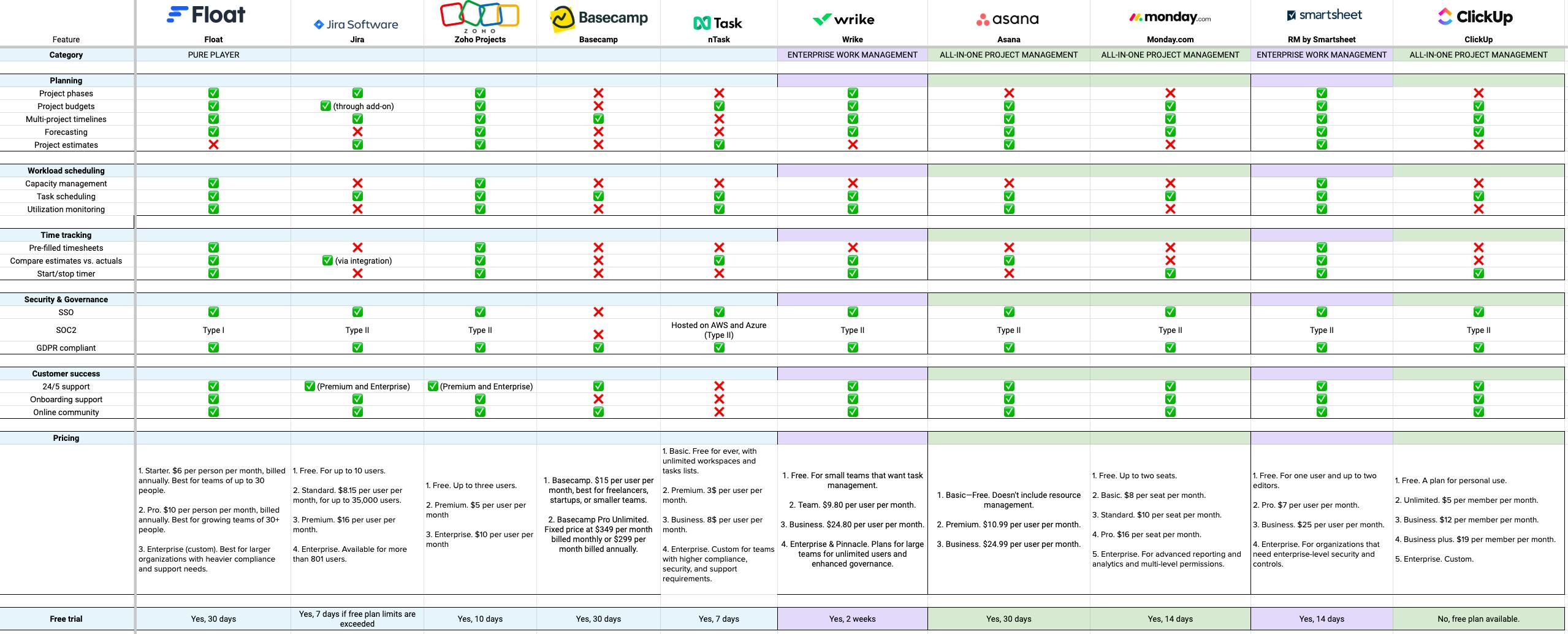 The differences lie in the scope of each tool. For example, Float focuses on resource management and allocation so you can schedule work effectively, Asana focuses on task management with some workload management capabilities, while ClickUp is a robust enterprise platform including a CRM.